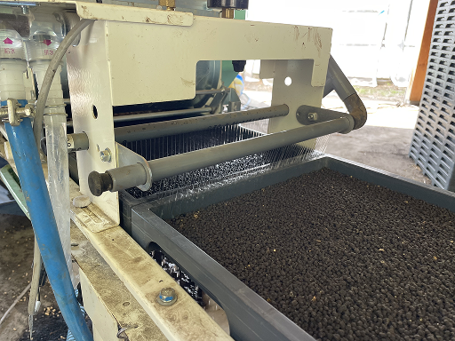 育苗箱に土と一緒に種をまきます。均等に広がるよう丁寧に行います。